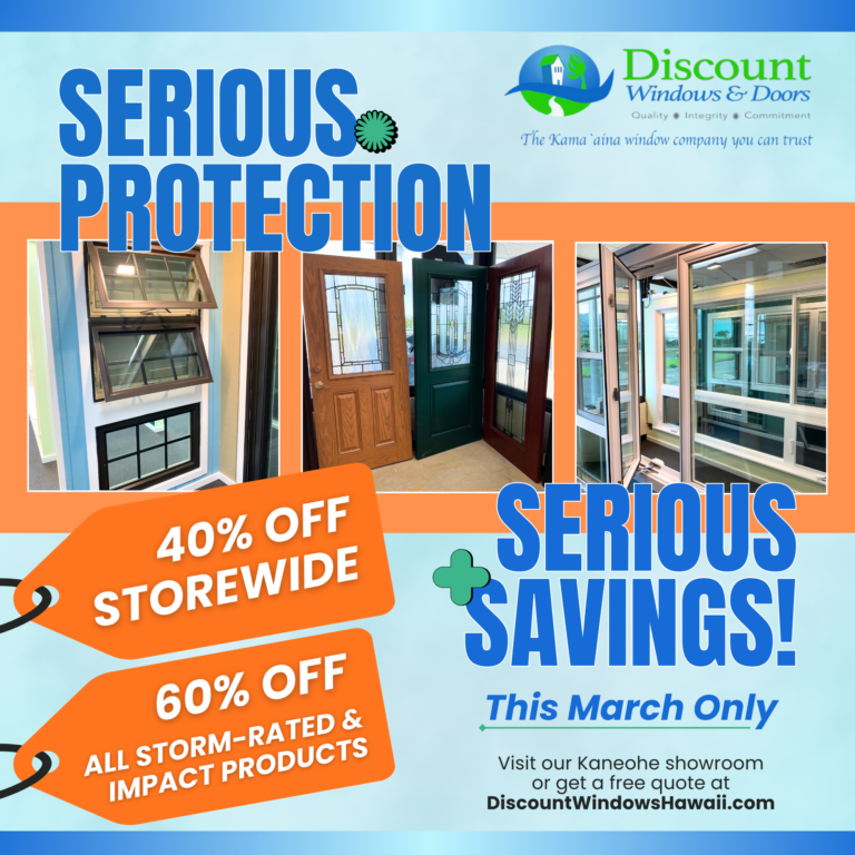 No other window in Hawaii can match the quality, strength, longevity and value of Makai Vinyl Windows and Doors! Sold exclusively by Discount Windows & Doors are specifically engineered for Hawaii. These products are designed for strength and to withstand our intense UV exposure, salt, humidity, and weather conditions.